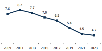 Nevertheless, in 2023, 4.2% of the U.S. households were unbanked, equivalent to nearly 5.6 million U.S. households. Across the 2023 FDIC National Survey of Unbanked and Underbanked Households, the unbanked population consists primarily of lower-income households, less-educated households, Black households, Hispanic households, working-age households with a disability, and single-mother households. This percentage was the lowest since the survey began in 2009 (Figure 5), consistent with the progressive adoption of alternative financial services in the country.