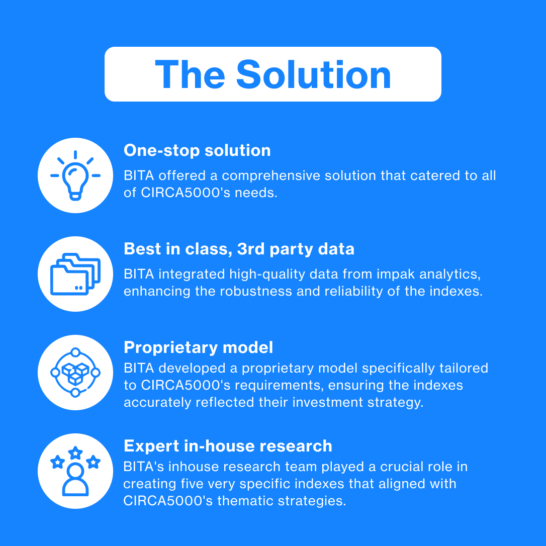 Expert in-house research: BITA's in-house research team played a crucial role in creating five very specific indexes that aligned with CIRCA5000's thematic strategies.
