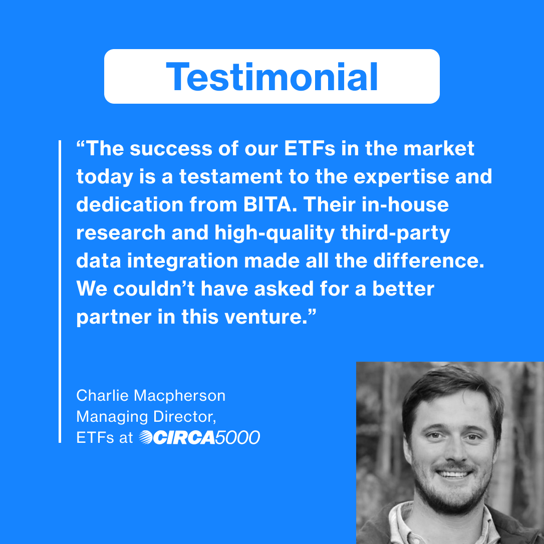 “BITA exceeded our expectations by delivering a service that not only catered to our every need but was also tailored specifically for us. The success of our ETFs in the market today is a testament to the expertise and dedication from BITA. Their in-house research and high-quality third-party data integration made all the difference. We couldn’t have asked for a better partner in this venture.”