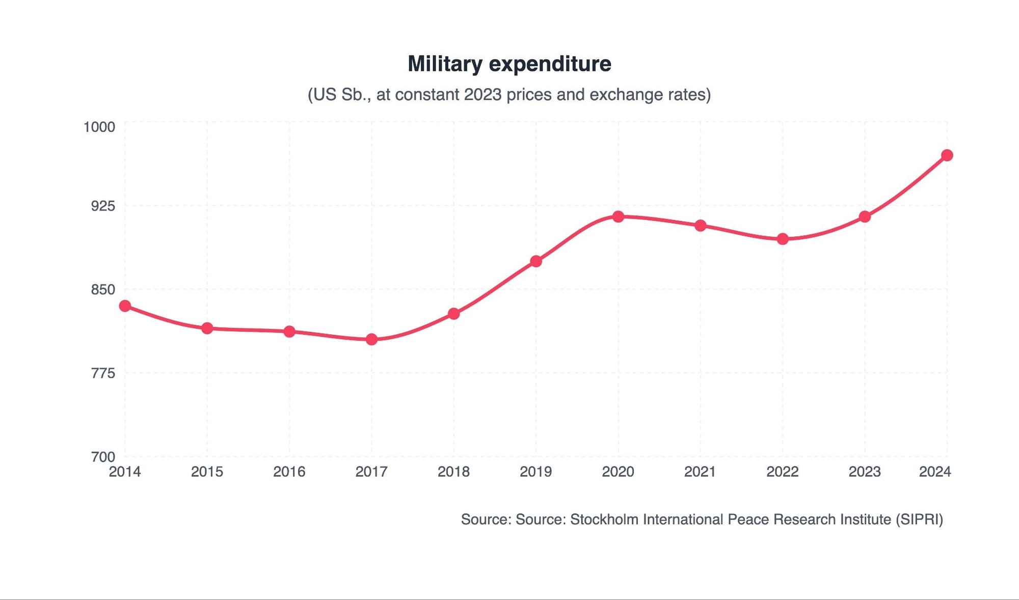 This trend has accelerated significantly in the 2020s, with the Biden administration requesting and Congress appropriating record peacetime budgets. For fiscal year 2024, according to independent sources such as the SIPRI suggest the military expenditure surpassed $960 billion, continuing a multi-year pattern of increases that consistently outpace inflation.