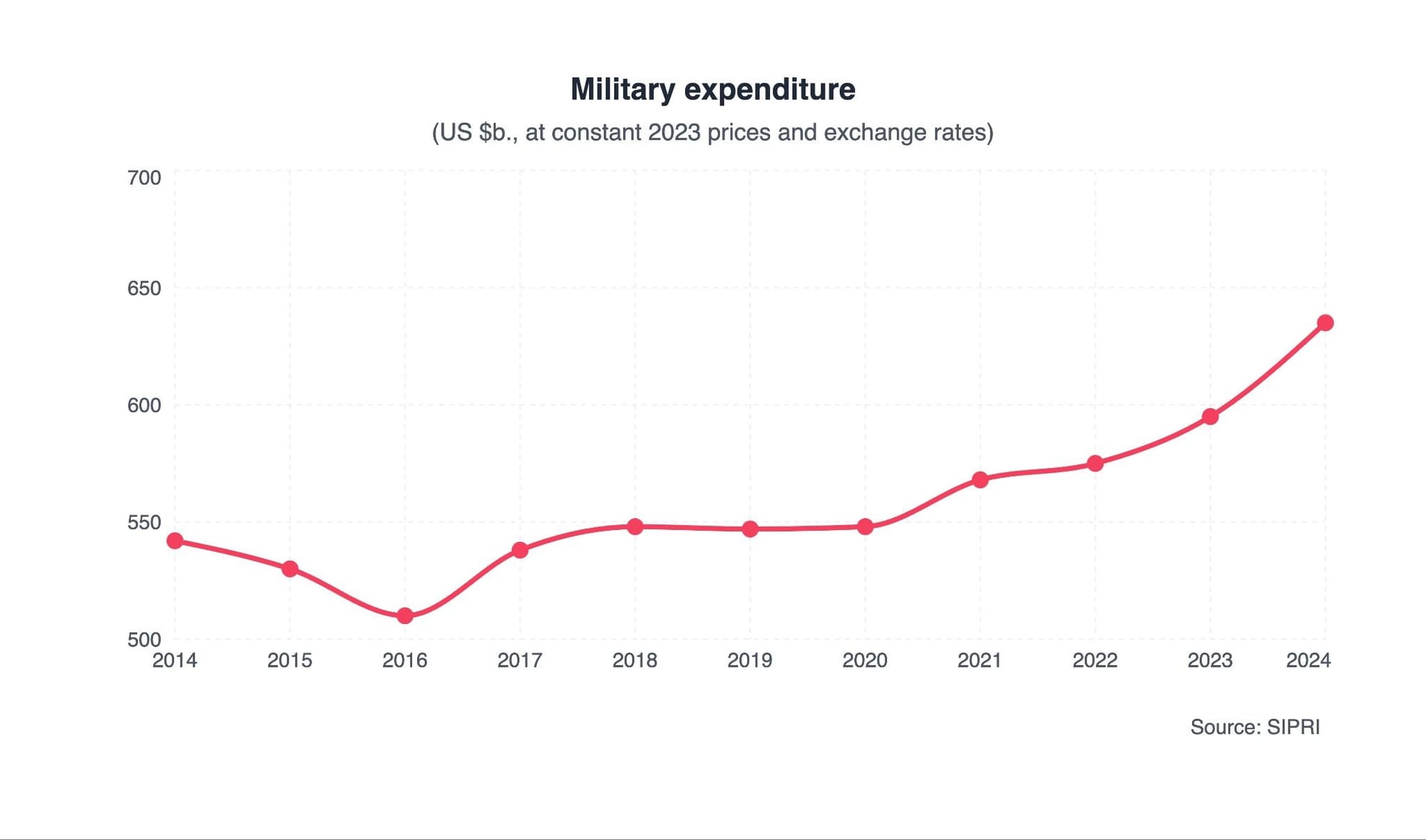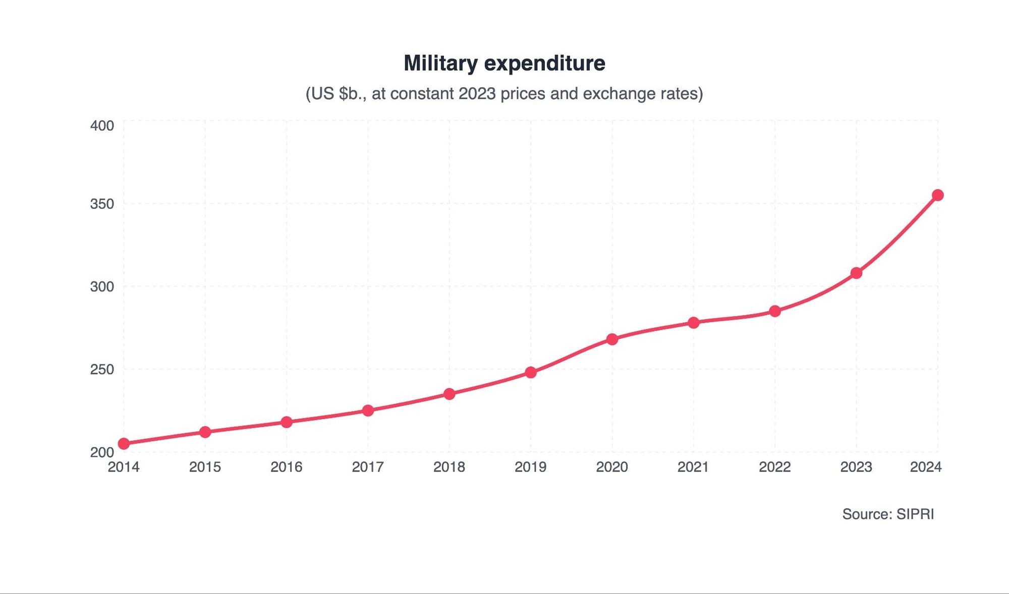 Defense spending across the rest of the world, including major powers in the Indo-Pacific, the Middle East, South Asia, and Latin America, has seen a marked and sustained increase in recent years, reflecting a global trend of heightened regional insecurity and strategic competition.