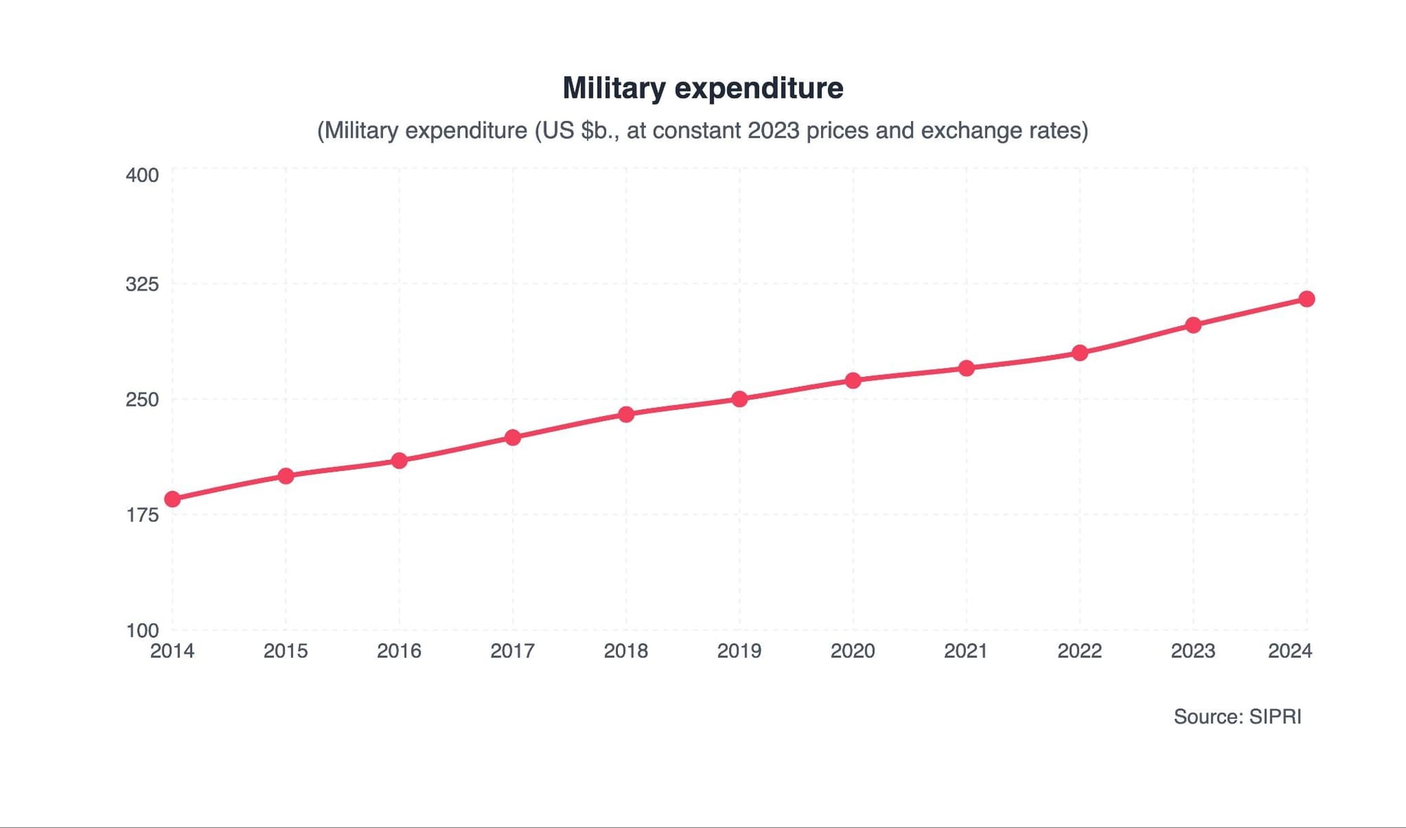 China’s defense spending has grown steadily over the past decade, reflecting Beijing’s focus on modernizing its military and expanding its strategic capabilities. Beyond the official figures, SIPRI suggest actual Chinese military expenditure has increased year-on-year, rising from roughly US$185 billion in 2014 to approximately US$318 billion in 2024, with consistent increases of around 7.2 % in recent years as part of a decade-long trend of growth. This makes China the second-largest military spender in the world after the United States.