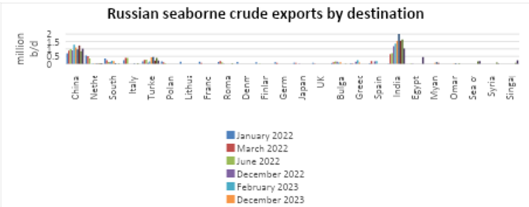 On the other side, Russia’s Urals crude, whose main market was European customers, had to look for new markets to replace the previous European customers, facing large discounts to attract Indian clients. For Russian Pacific crude, primary markets are China and other Asian customers. As it can be observed in the chart below, China and India are the two countries that have benefited the most from discounts in Russian crude prices, especially India who started acquiring Russian crude after sanctions were imposed, and assumed the role as refiner of oil products to re-export to other states, including European countries—to tackle this mechanism, the EU 18th sanctions package included an import ban on refined oil products derived from Russian crude.