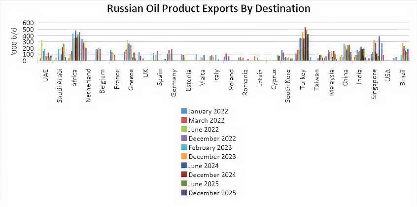 In the case of Russian oil products, Turkey has stood out by notably increasing its imports to become the main destination of Russian oil products exports. Singapore, China, India, Brazil, and African countries (mainly Egypt, Tunisia, and Libya), also became important markets for these products, and until the Strait of Hormuz closed, UAE and Saudi Arabia as well.