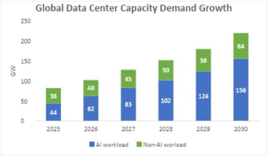 The global demand for data center capacity is expected to nearly triple by 2030, with an estimated 70% of this demand stemming from AI workloads. Mid-range scenarios project that global demand for data center capacity could rise at a CAGR of 22%, with demand increasing from 89 GW in 2025 to 219 GW in 2030.