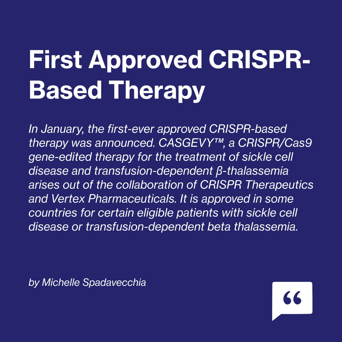 - In January, the first FDA-approved CRISPR-based therapy was announced.