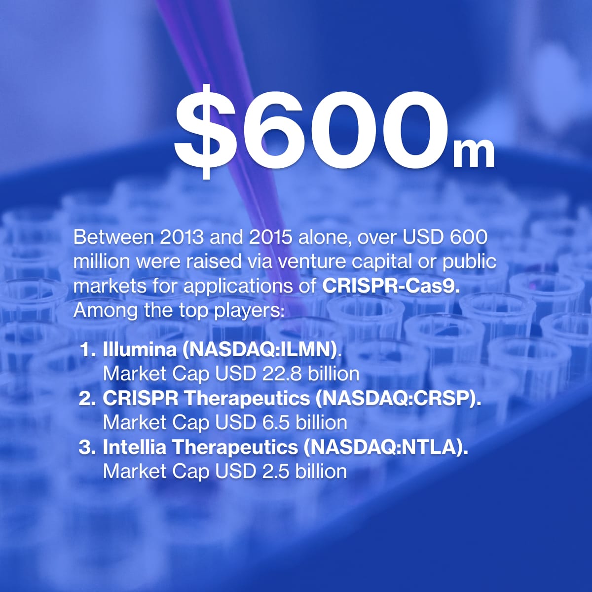 Between 2013 and 2015 alone, over USD 600 million were raised via venture capital or public markets for applications of CRISPR-Cas9. Among the top players: