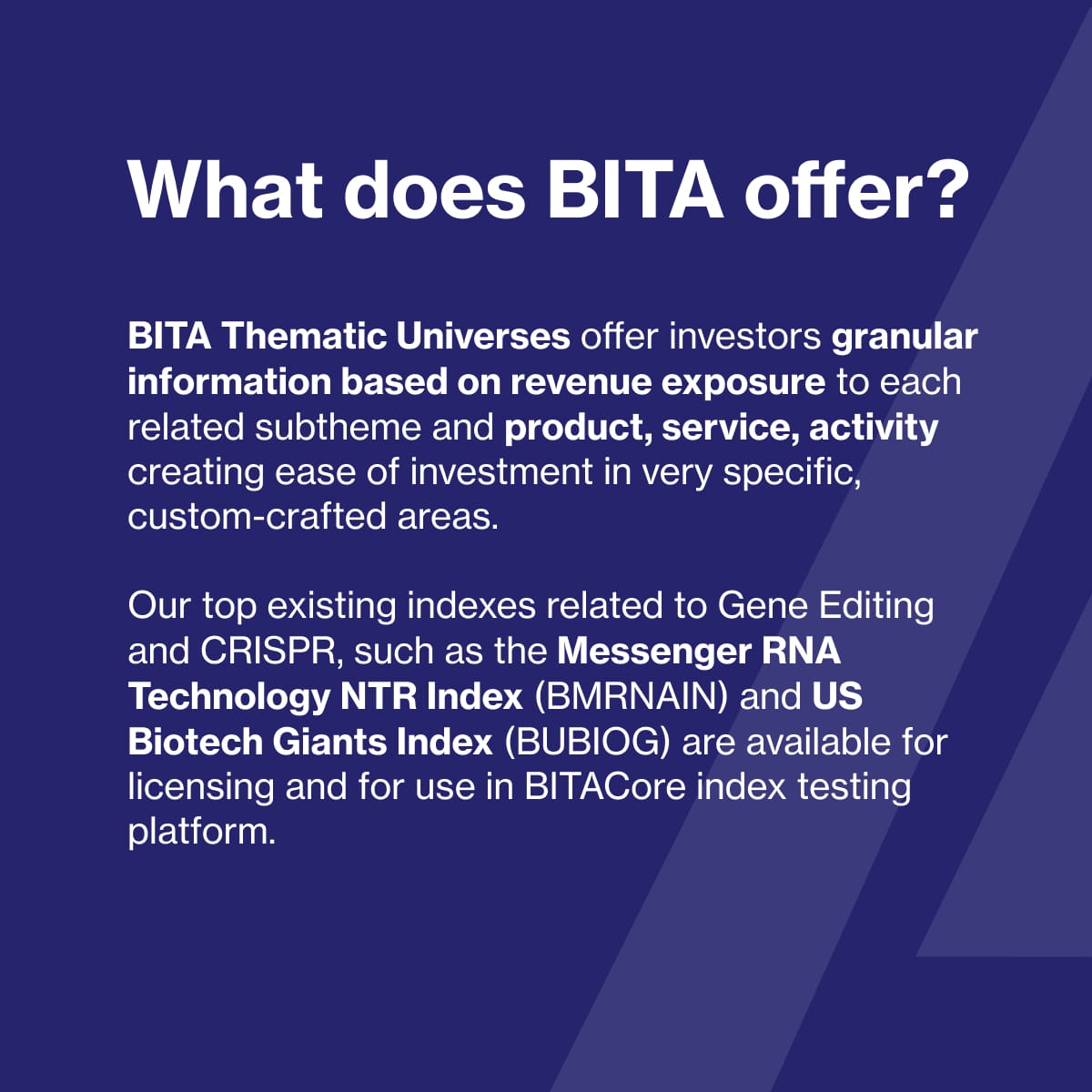 - Some of our top existing indices related to Gene Editing and CRISPR, such as the Messenger RNA Technology NTR Index (BMRNAIN) and US Biotech Giants Index (BUBIOG) are available for licensing and for use in BITACore index testing platform.
